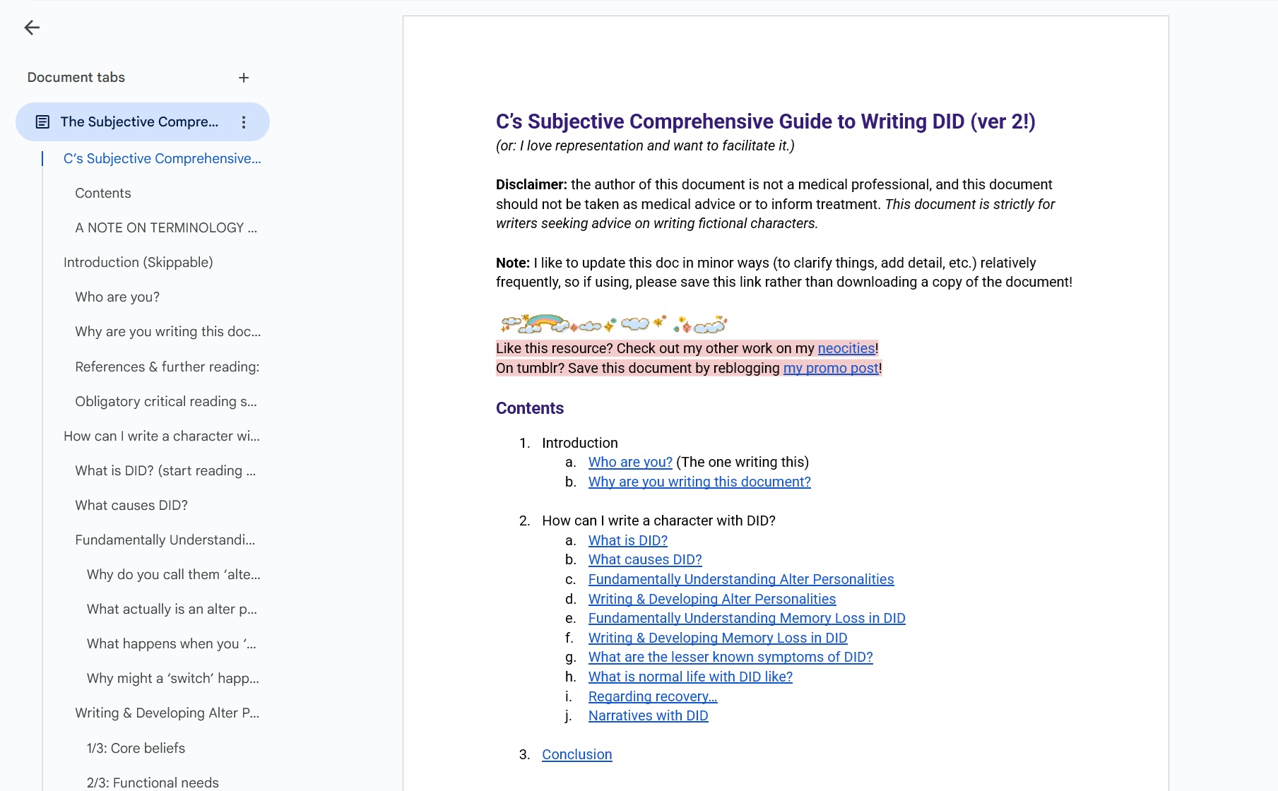 here i store the reasonable-yet-extensive document i have developed containing everything i think a person writing a character with DID would benefit from reading and considering.